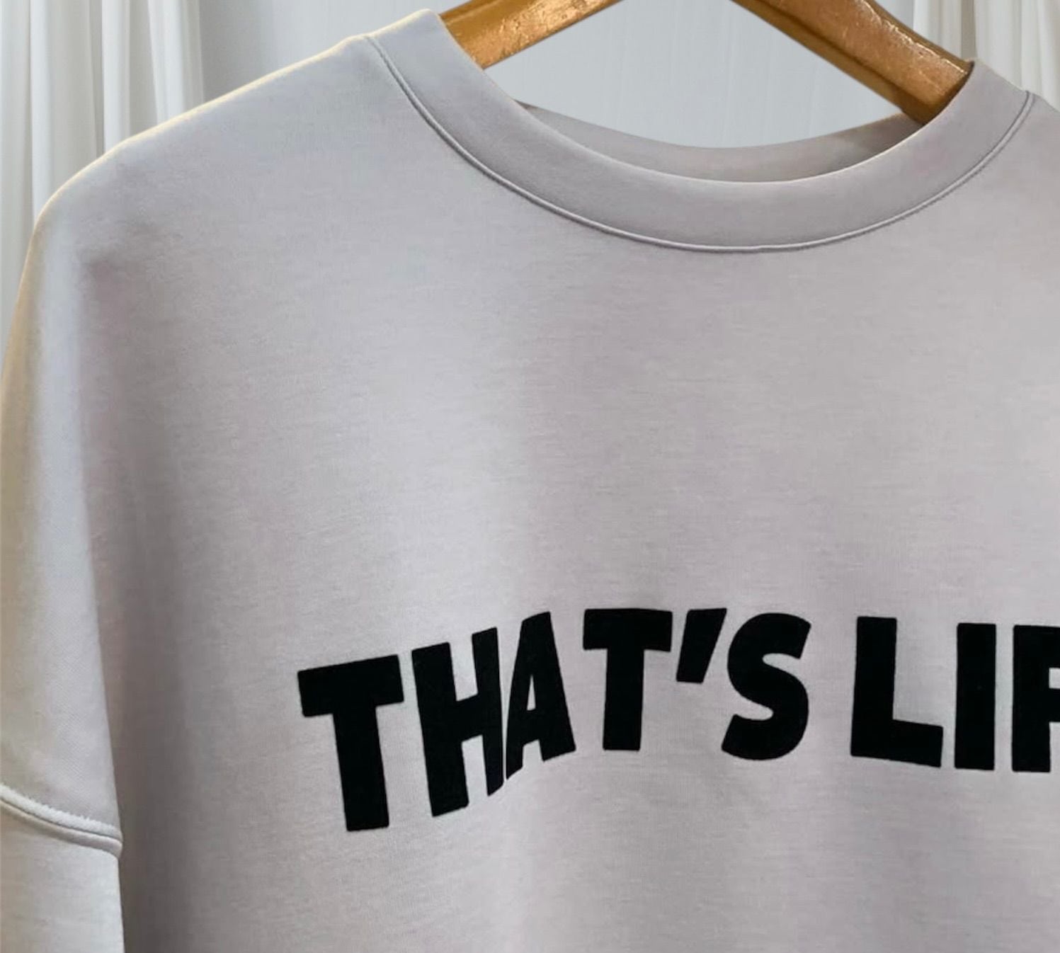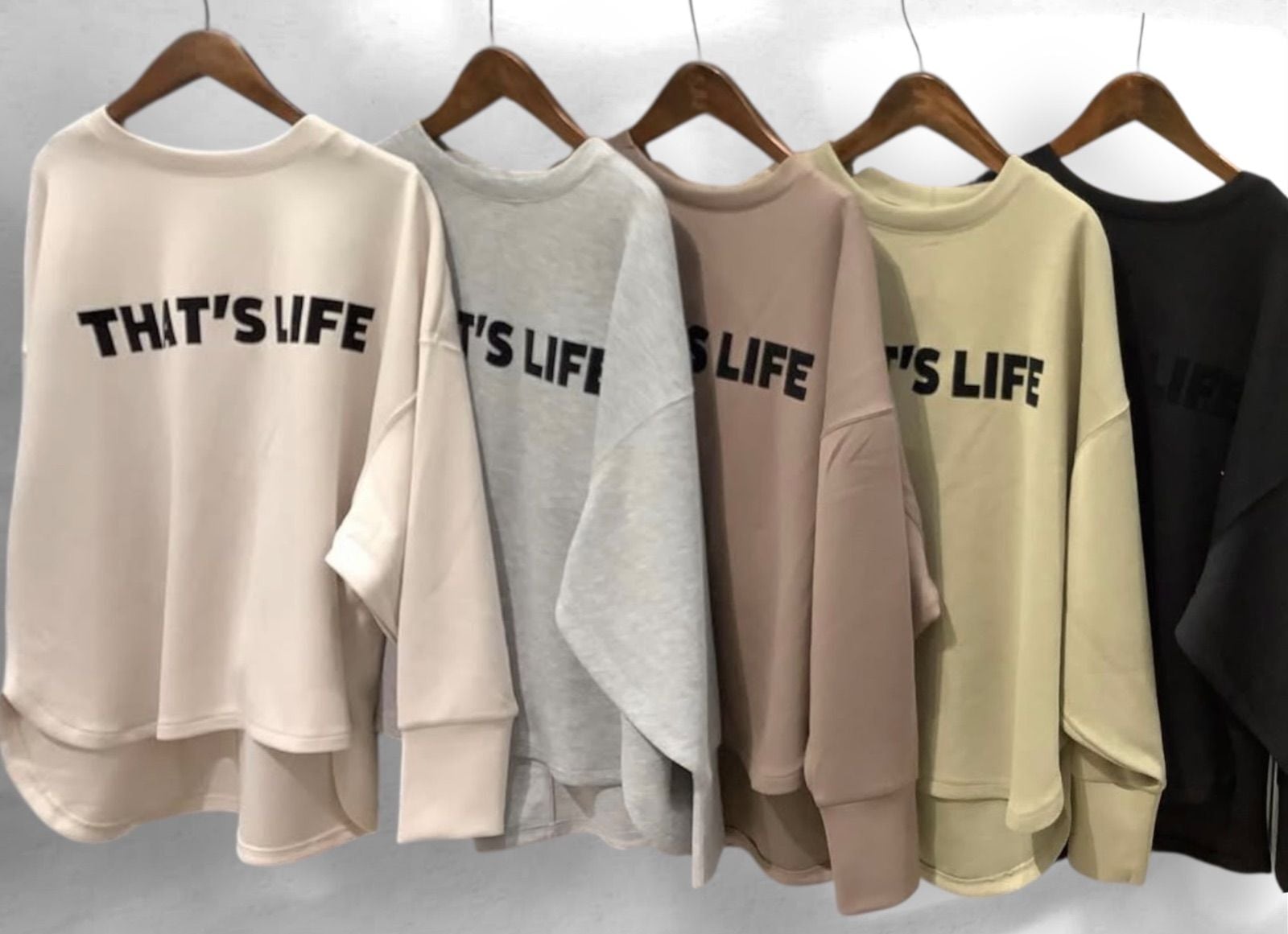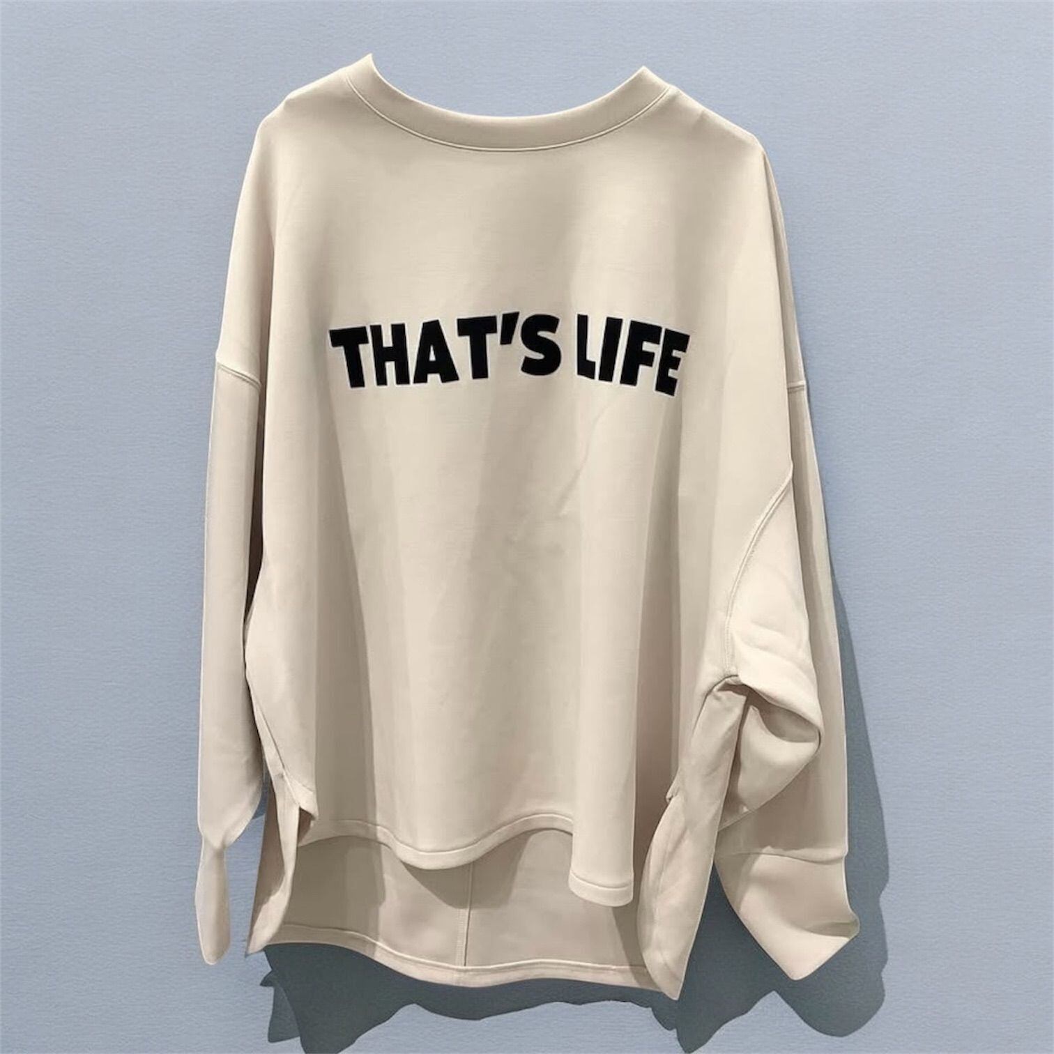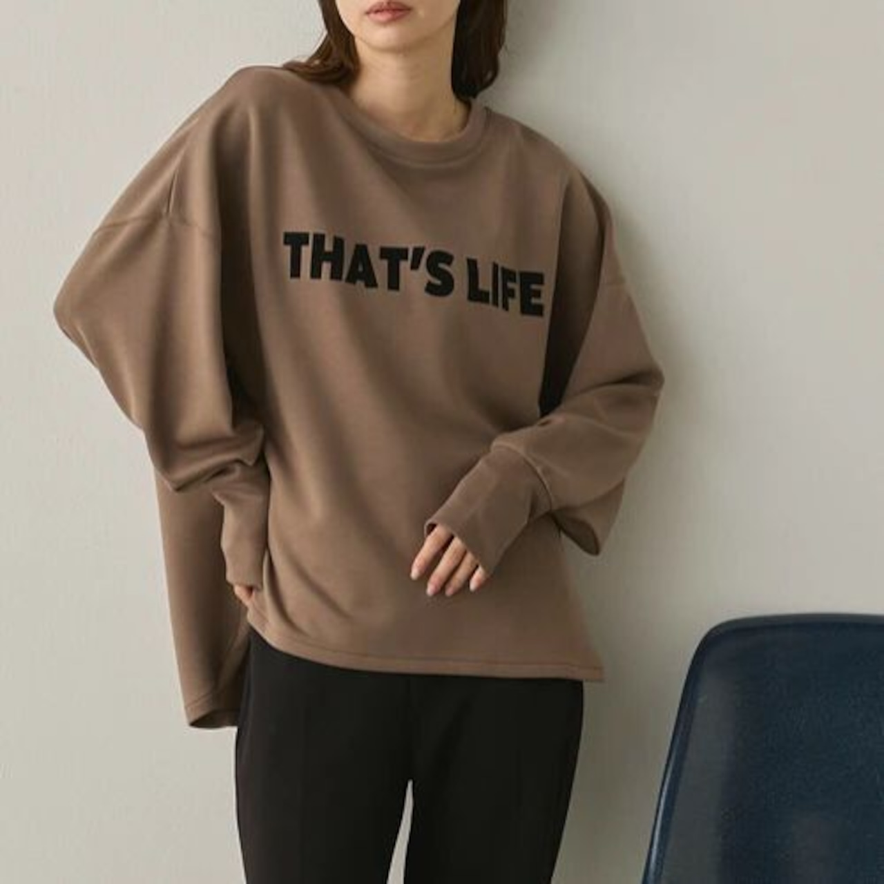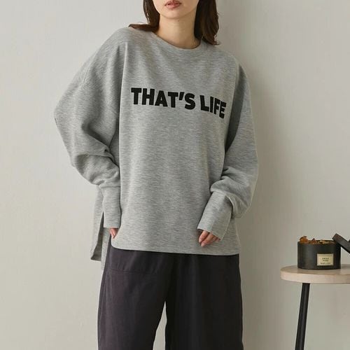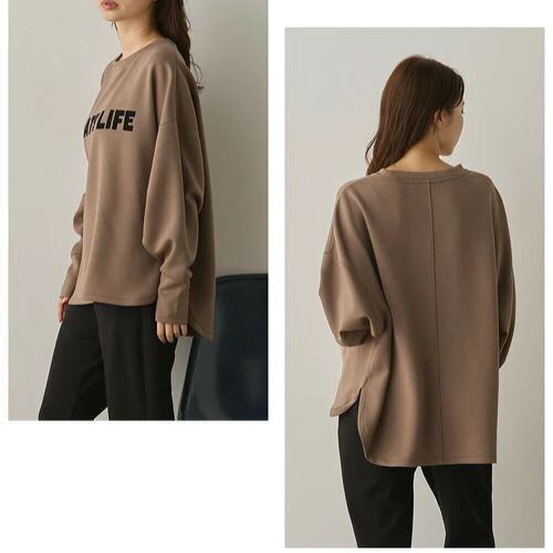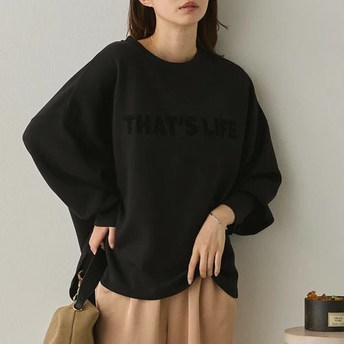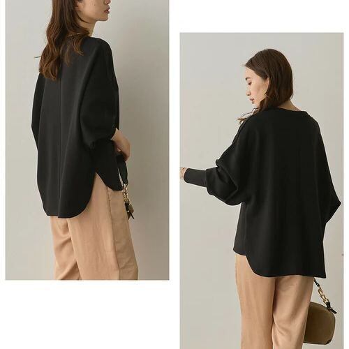 ドロップショルダーとゆったりシルエットで体型をさりげなくカバーしつつ、