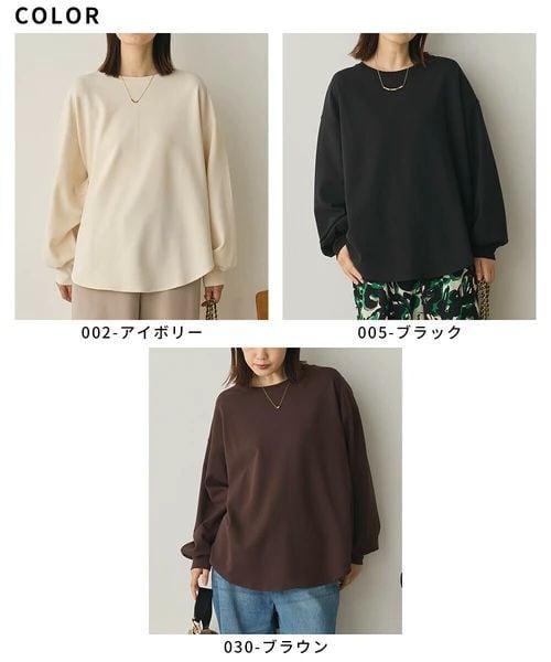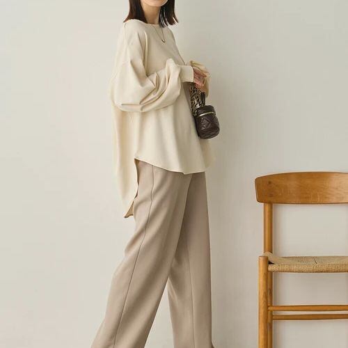 落ち感のある生地が女性らしいシルエットを引き立て、シンプルながらも洗練された印象に仕上げています。