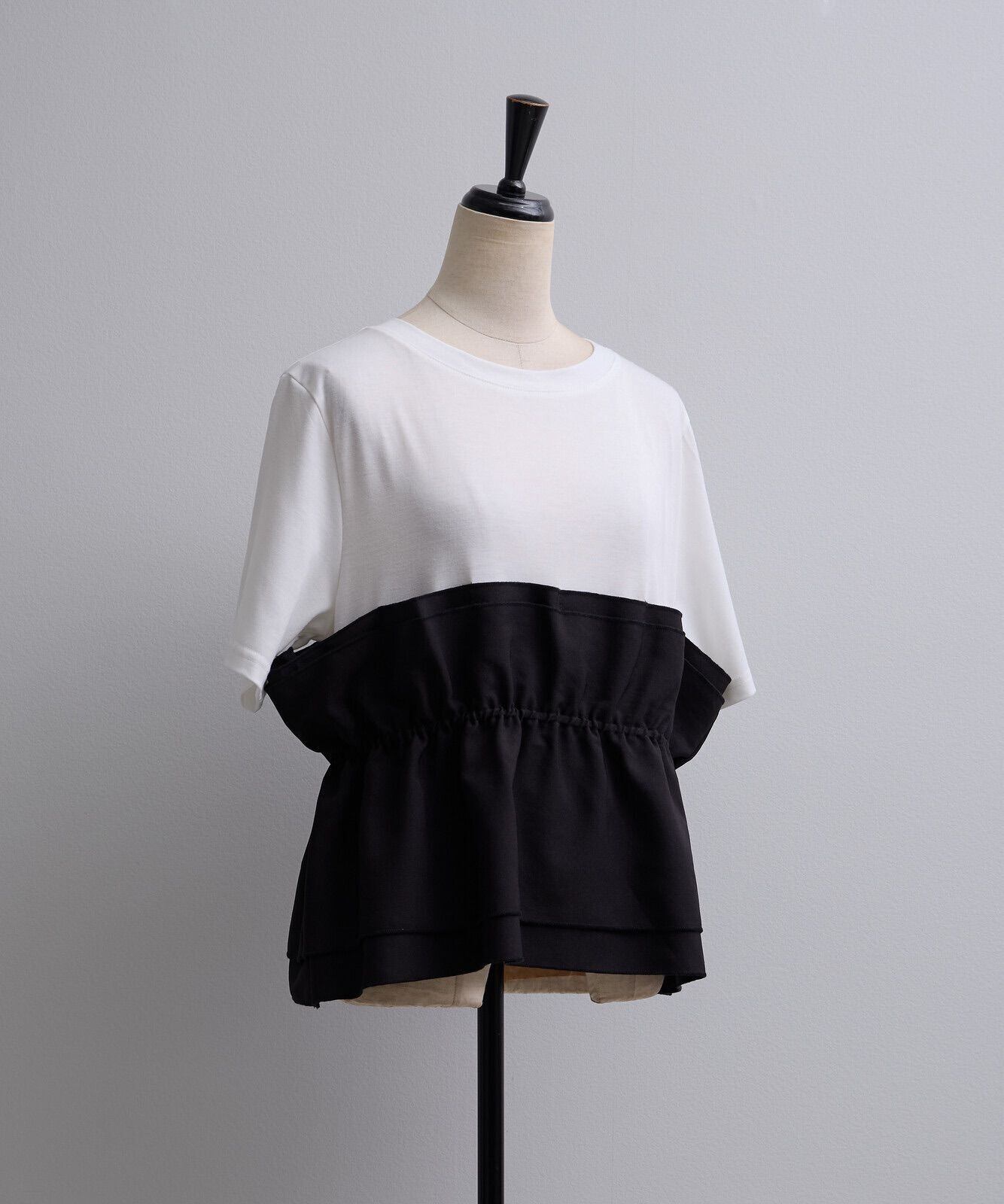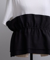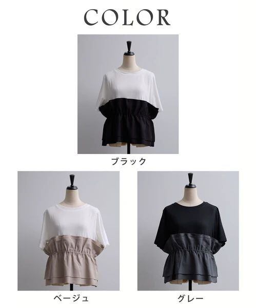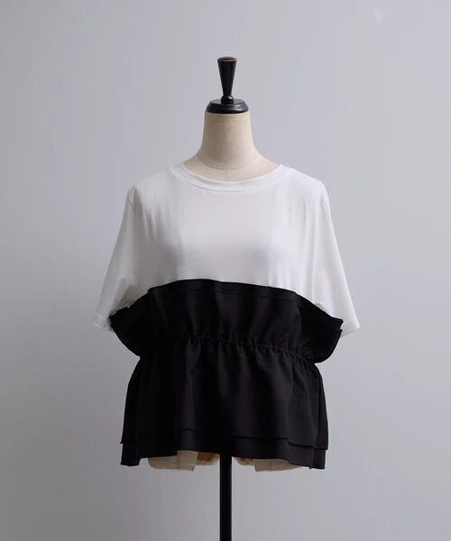 シンプルなTシャツにビスチェ風デザインを重ねたようなトレンド感のあるフェイクレイヤードトップス。