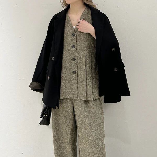 同素材のパンツと合わせたセットアップスタイルなら、ちょっとしたお呼ばれやオケージョンシーンにも対応できる、洗練された大人のコーディネートが完成します。