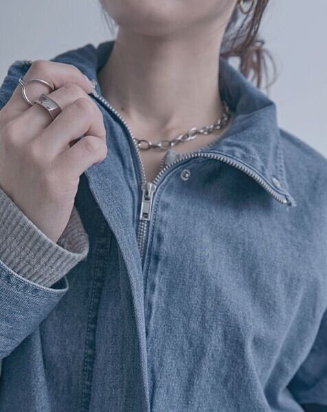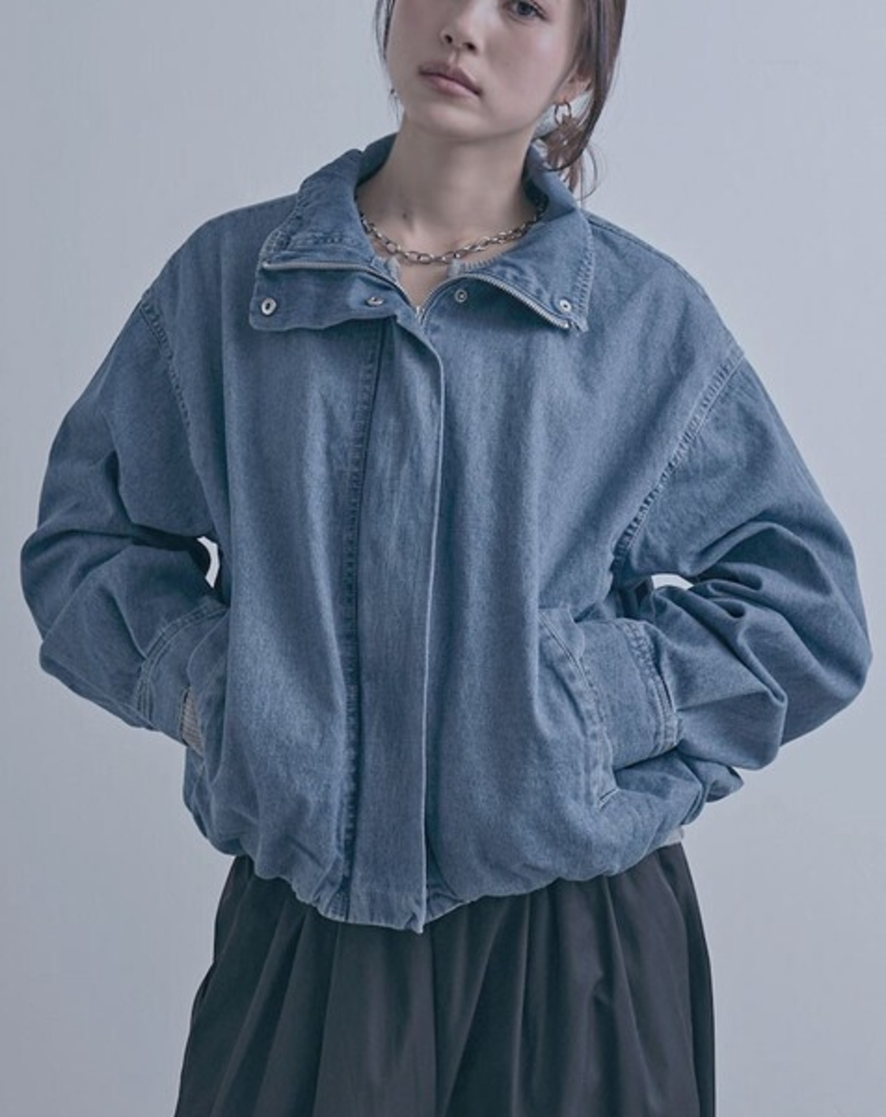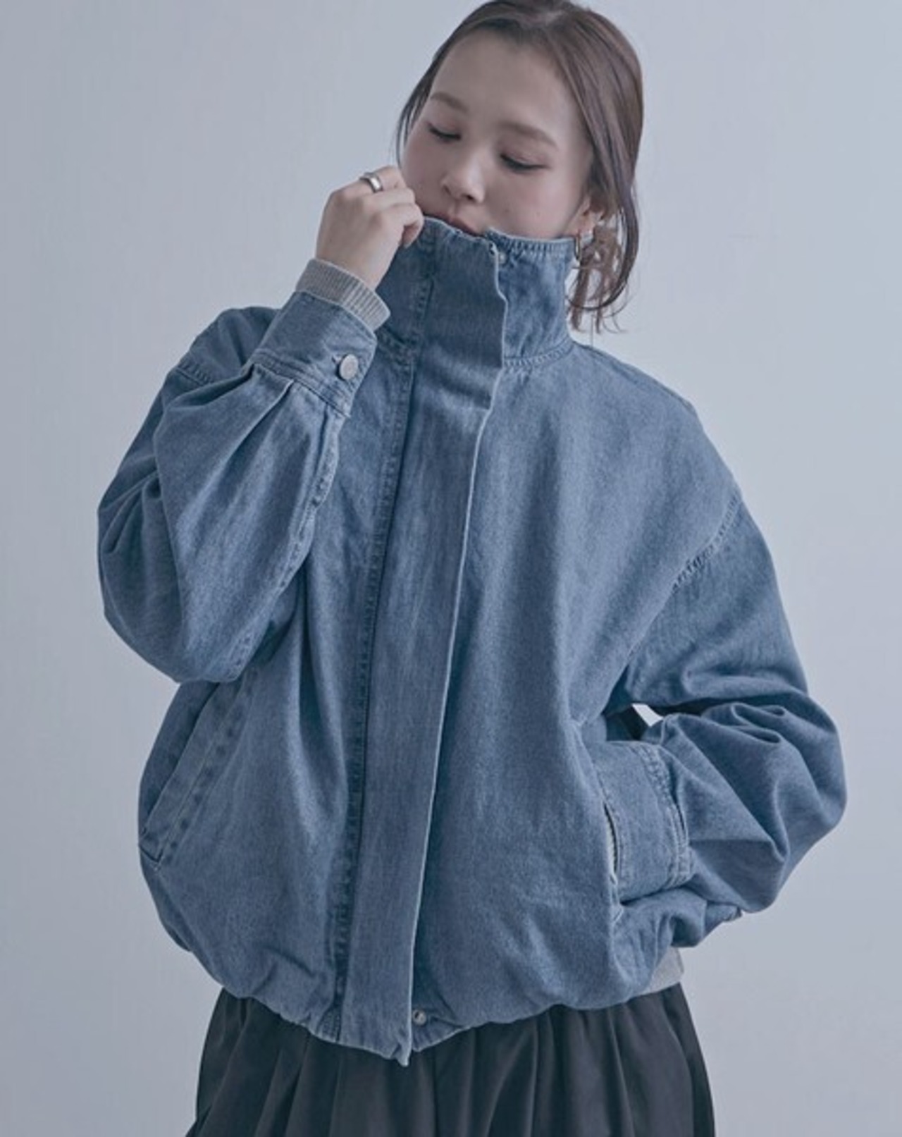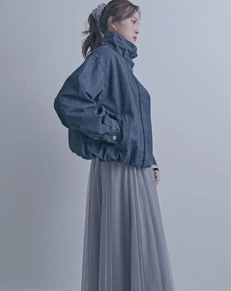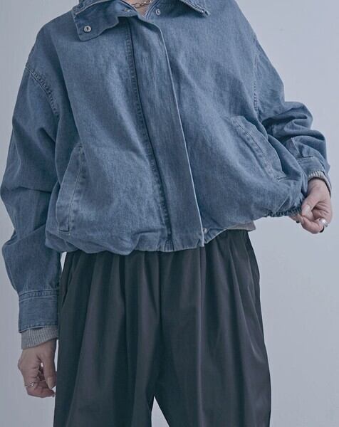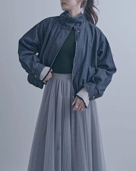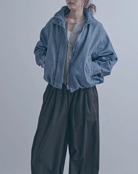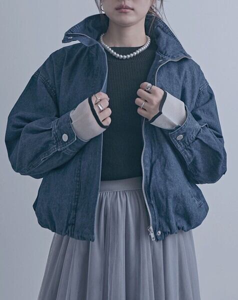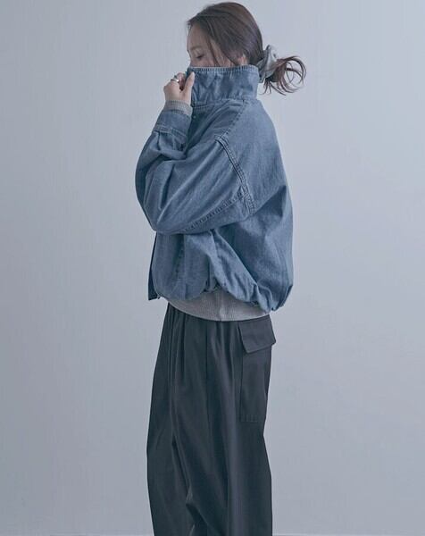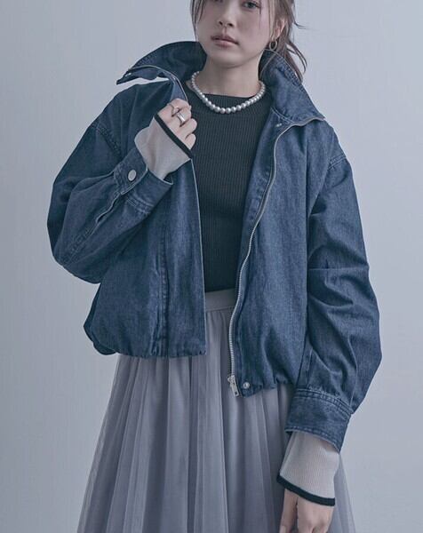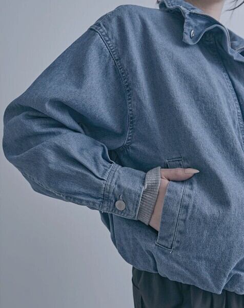 スタンドカラーデザインが印象的なデニムブルゾンジャケット。