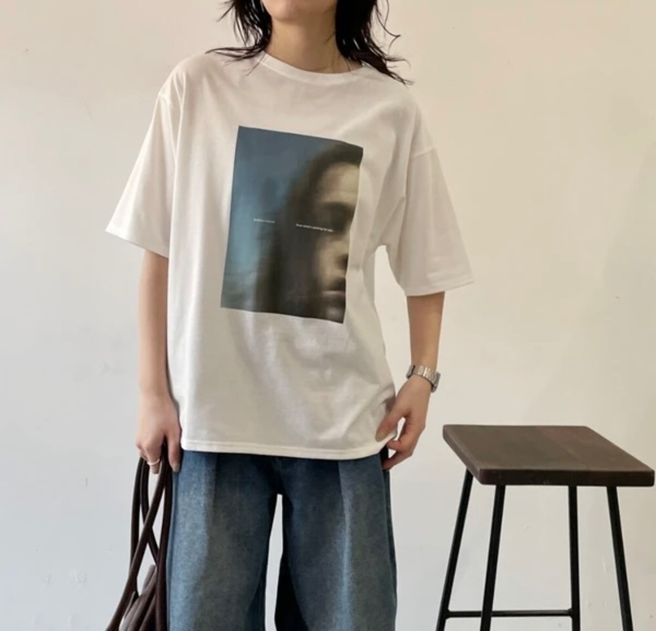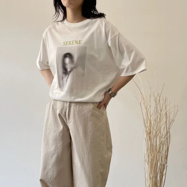 繊細で曖昧な表現のグラフィックがスタイリングに奥行きを与え、シンプルながらも洗練された雰囲気を演出します。